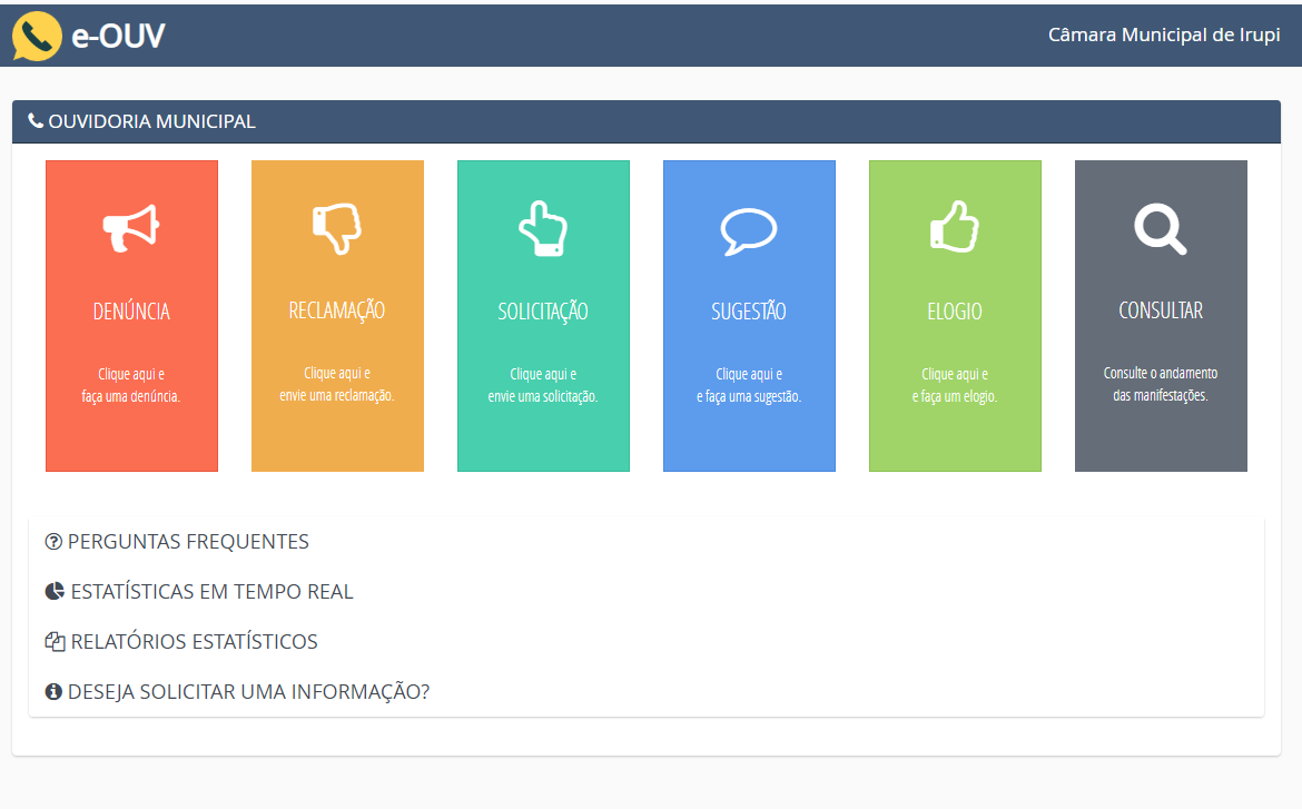 A Ouvidoria é órgão de interlocução coma a sociedade disponível para o recebimento de reclamações, denúncias, sugestões, elogios, tudo o que for relacionado às atribuições e competências do legislativo irupiense.